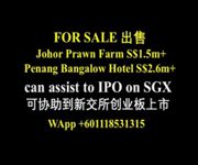 SGX IPO potential【For Sale : Johor Seaside Land + Prawn Farm】can assist to IPO on SGX Catalist !!【出售: 柔佛海边土地+养虾场】可协助操盘在新加坡证券交易所-创业板上市 💜Size: 6 Acres (Seaside Freehold Land) & 10~50 acres (for Sea Farming) 面积:6 英亩 (永久产权海边土地) & 10-50英亩 (海上养殖) 💜Selling Price: SGD$1.5m cash + remaining SGD3.5m via...